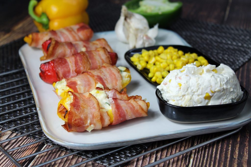 Ich nenne die Dinger auch gerne Paprika Schiffchen. Der Länge nach aufgeschnitten werden die Paprikahälften gefüllt. Bei mir mit Frischkäse, gehackten Jalapeños und Mais. Um die gefüllten Paprikahälften wird dann nur noch ein wenig Frühstücksspeck gewickelt. Und ab damit auf den Grill. Hey und eh klar: Das gelingt natürlich auch im Backofen, siehe Rezept unterhalb.