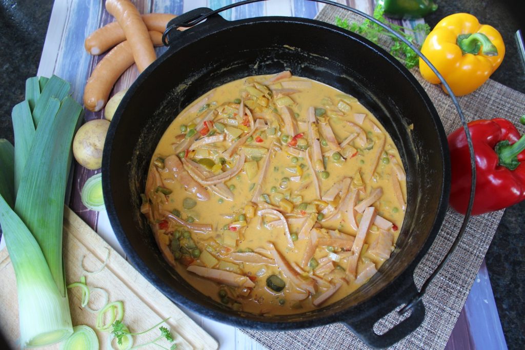 Dieses Geschnetzelte ist ein Allroundgericht. Und zwar in zweifacher Hinsicht: Zum einen benötigt man bei normalem Schweinegeschnetzelten immer Beilagen. Seien es Spätzle, Kroketten oder Nudeln. Und auch noch Gemüse oder einen Salat. Nicht hier Freunde: Das Wurstgeschnetzelte ist ein absolutes One-Pot-Gericht. Alle Zutaten wandern in den Topf und später auf den Teller. Aus diesem Grund ist das Rezept auch perfekt als Familienessen, wenn es flott gehen soll. Und eben nicht zwei Töpfe und drei Pfannen in Betrieb genommen werden müssen. Anderseits ist dieses Geschnetzelte auch perfekt für eine Party. Nicht einmal ein Beilagen-Baguette ist nötig, denn wir haben Kartoffeln mit an Bord. Am Vortag gekocht ist es als Mitternachtssuppe sehr schnell aufgewärmt und serviert.