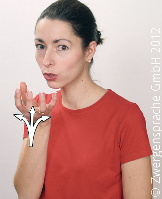 Die Finger der linken Hand sind, mit der Handfläche nach innen, vor dem Körper gestreckt, Daumen angelegt. Alle Fingerspitzen der rechten Hand zusammenhalten und 2x in die Handfläche der linken Hand tippen.