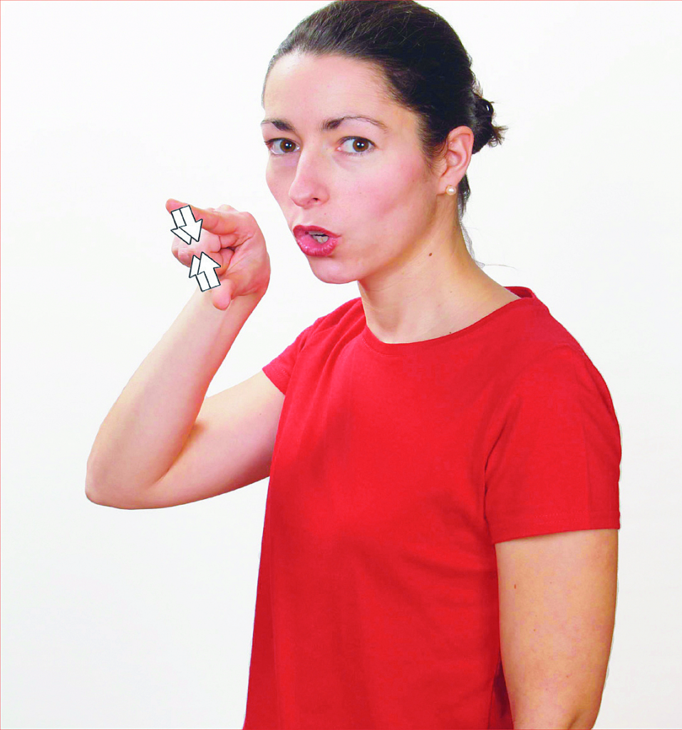 Die rechte Hand auf Brusthöhe zur Faust ballen, Daumen nach oben abgespreizt. Die Faust dreimal öffnen und wieder schließen.