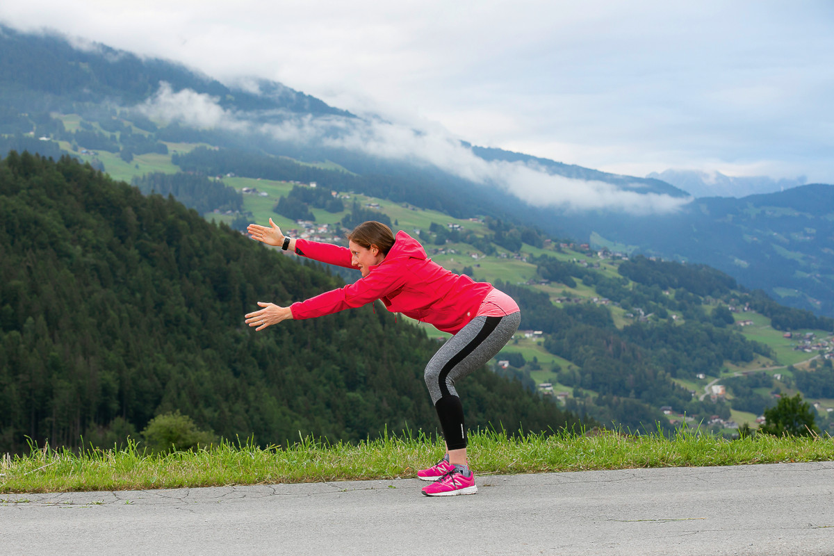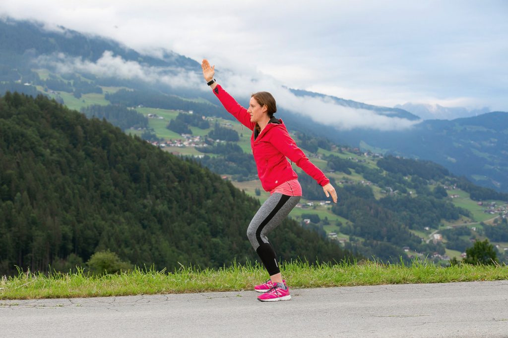Zum Aufwärmen stellen Sie sich etwa hüftbreit hin und kreisen die Arme. Zuerst beidseitig vor, dann zurück. Dabei gehen Sie schon in eine lockere Kniebeuge. Die Zehenspitzen zeigen nach außen, die Knie zeigen in Richtung der Zehenspitzen. Nach und nach lehnen Sie sich mit dem Oberkörper immer weiter vor. Der Rücken ist gerade, die Schulterblätter ziehen Sie in Richtung Hosentaschen und der Blick ist nach vorne gerichtet. Den Bauchnabel ziehen Sie sanft zur Wirbelsäule. Das ist nun die Ausgangsposition für die nächsten Übungsabläufe.