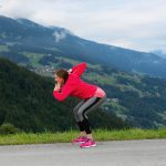 AUSFÜHRUNG: Zuerst in der Kniebeuge mit vorgebeugtem Oberkörper die Hände zu den Ohren halten und die Ellbogen seitlich kreisen. Den Blick leicht nach vorne richten. Den Rücken lang machen und die Schulterblätter in Richtung Hosentaschen ziehen.