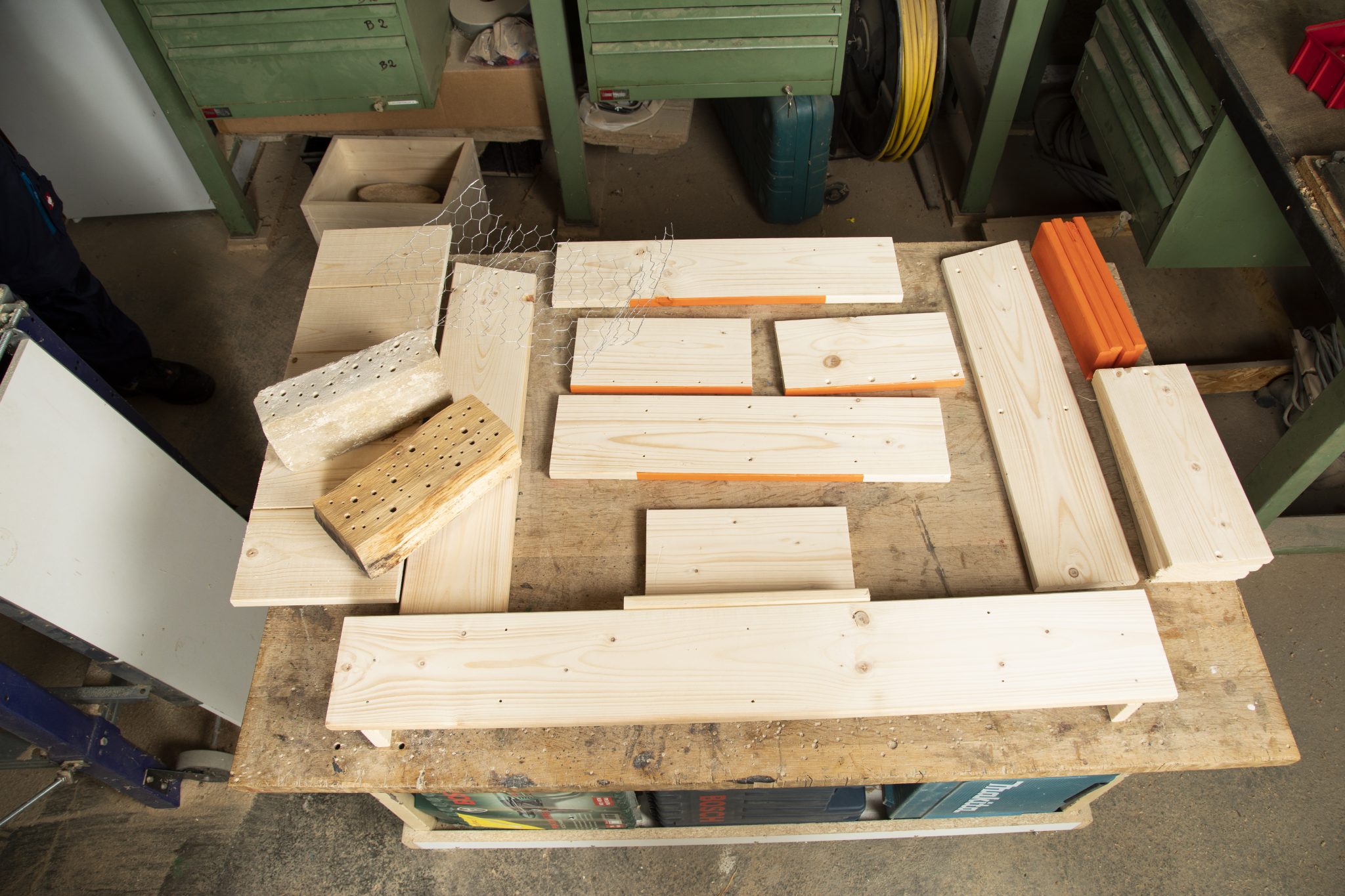 Rund acht Meter Bretter, hier 14 cm breit und 2 cm hoch. Eine Schilfmatte mit möglichst unterschiedlichen Durchmessern der Röhrchen (solche sind zudem die billigsten!), ein Bambusrohr (zur Dekoration, Insekten siedeln sich dort kaum an), Ziegel, etwas Stroh, Holzscheite (Buche, Eiche) aus der Brennholzabteilung der Baumärkte sowie ein, zwei Laufmeter Hasengitter.