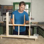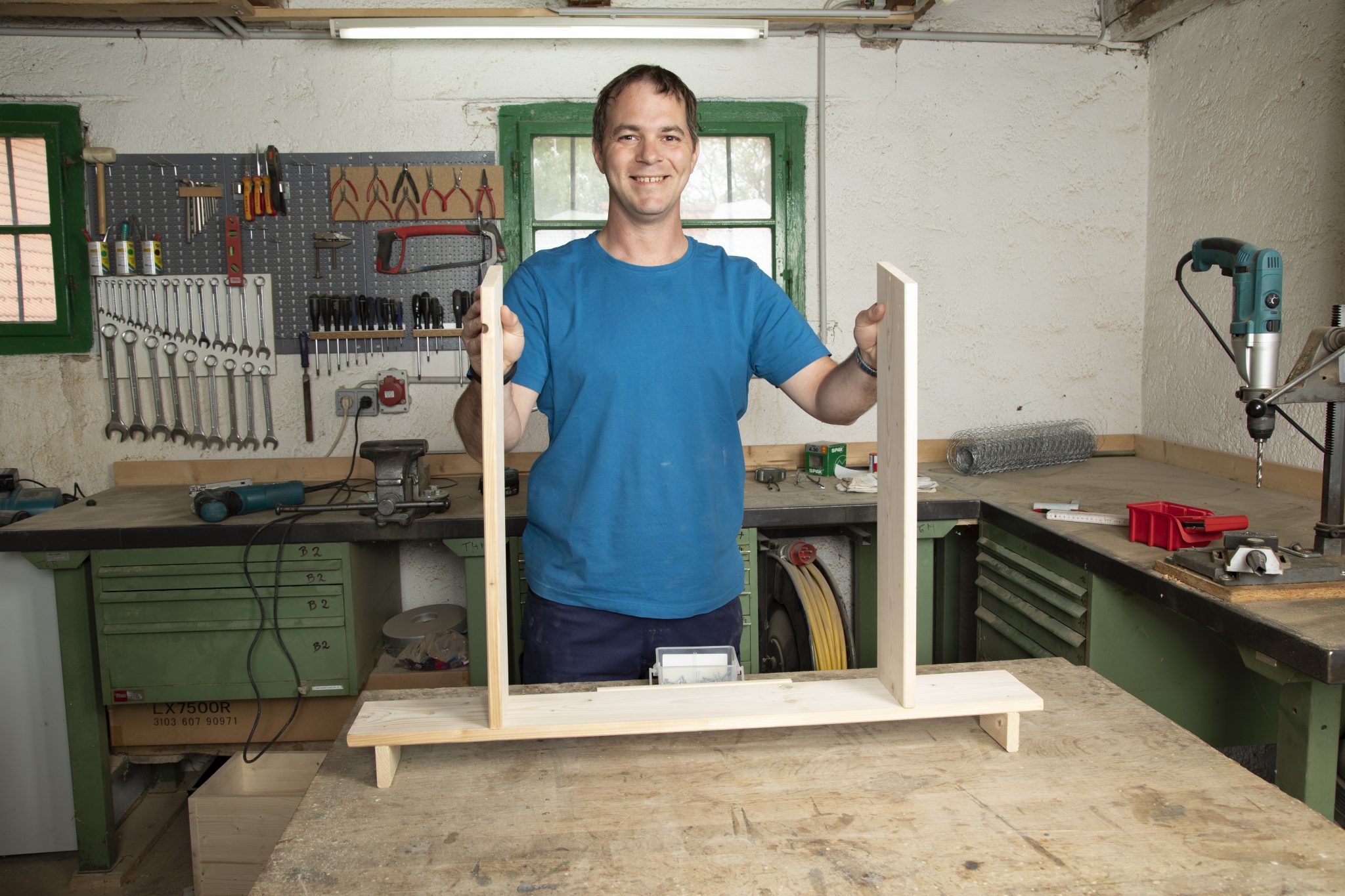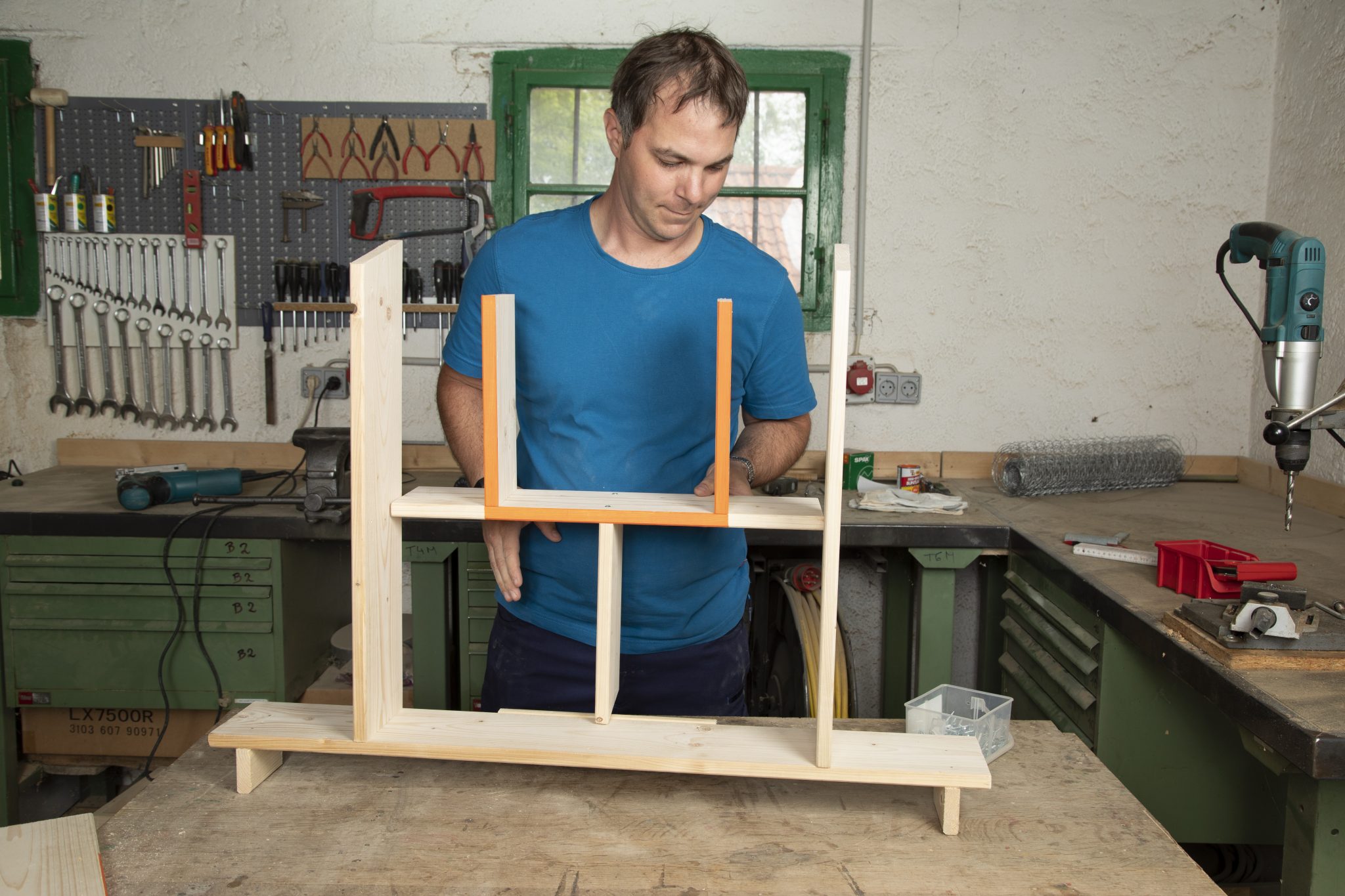 - Schritt: An das Basis-Brett (etwa 1 Meter lang) werden zwei 60 cm hohe Latten geschraubt. Diese sind an der oberen Seite schräg geschnitten, denn hier wird dann das Dach des Hotels (siehe Bild 8 und 9) befestigt. Als Beine (siehe Bild 2 und 3 links bzw. unten) für das Gerüst hat Stefan zwei 6 cm lange Stücke von den Glattkantbrettern zugeschnitten und sorgfältig unten angeschraubt.