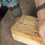 - Schritt: Nun der Innenausbau: In einen Holzscheit (gekauft in der Brennholzabteilung eines Baumarktes), den er auf 27 cm Länge zugeschnitten hat, bohrt Stefan Löcher – die „Höhlen“ für die künftigen Bewohner. Zu etwa drei Vierteln sollten die Löcher 3 bis 6 mm Durchmesser haben, zu einem Viertel 7 bis 9 mm. Wichtig ist es, die Kanten an den Eingängen der „Höhlen“ mit einer Feile zu säubern, damit die Insekten nicht durch kleine Holzspäne am Bezug ihrer künftigen Residenzen behindert werden. Und: Die Holzscheite keinesfalls vollständig durchbohren – wer will schon in einer zugigen Hotelsuite hausen? Nicht einmal Insekten. Also Höhlen, keine „Tunnels“ anfertigen. Das gleiche gilt für Ziegel, die man auf der anderen Seite statt Holz verwenden kann.
