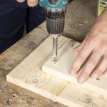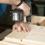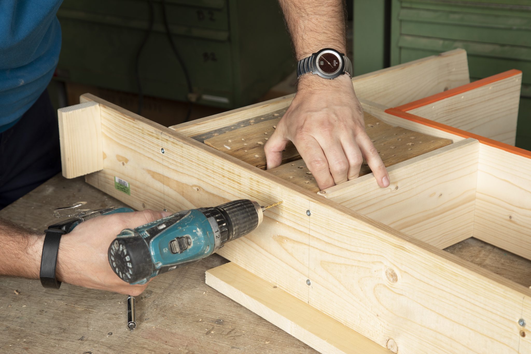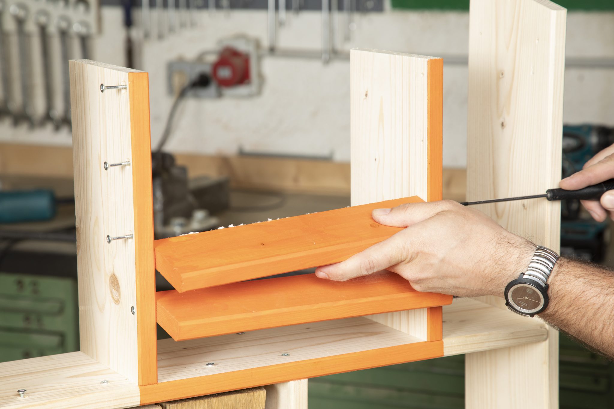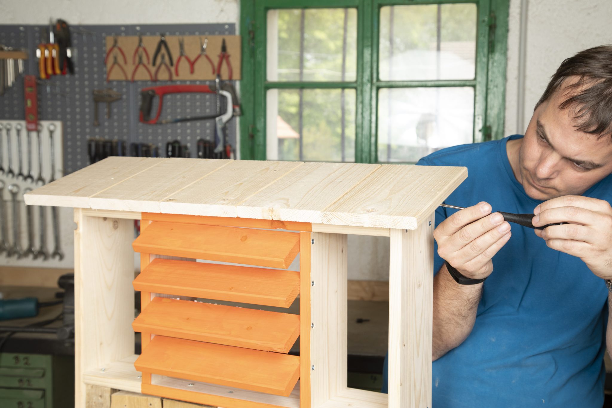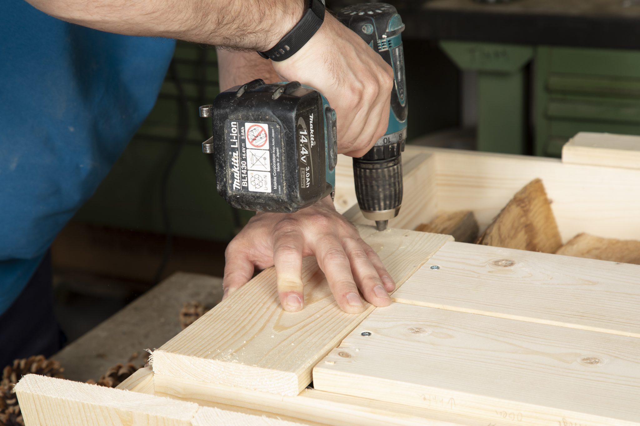 - Schritt: Die Holzscheite von der Unterseite her am Insektenhotel anschrauben.