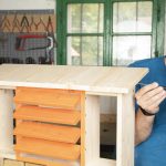 - Schritt: Die obere Etage bekommt natürlich eine Decke (das zweite der 56 cm langen Bretter) und ein Extradach: Stefan hat dafür fünf 22 cm lange Stücke als „Dachziegel“ geschnitten. Diese Stücke mit einem 56 cm langen Stück verbinden. Damit ergeben sich am Dach Rillen, über die das Wasser abrinnen kann.