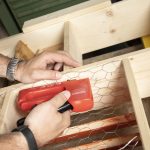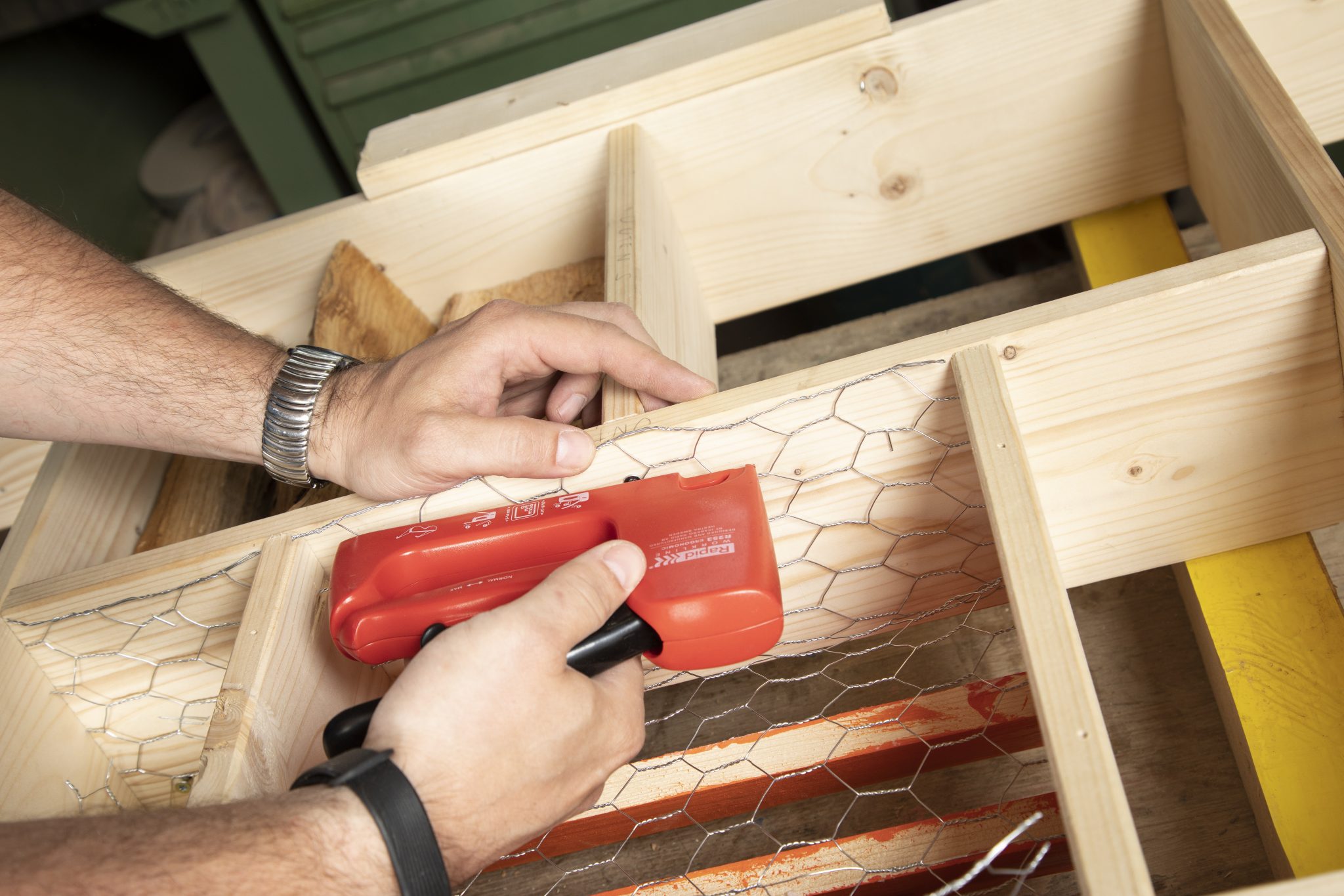- Schritt: Jedes Zimmer der oberen Etage hat ihr Interieur; damit es nicht an der Vorderseite herausfällt, Hasengitter antackern.
