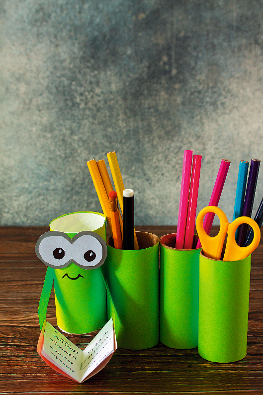 8. Nun bekommt die Raupe noch das Buch in die Arme. Fertig ist eine tolle Aufbewahrung für deine Stifte!