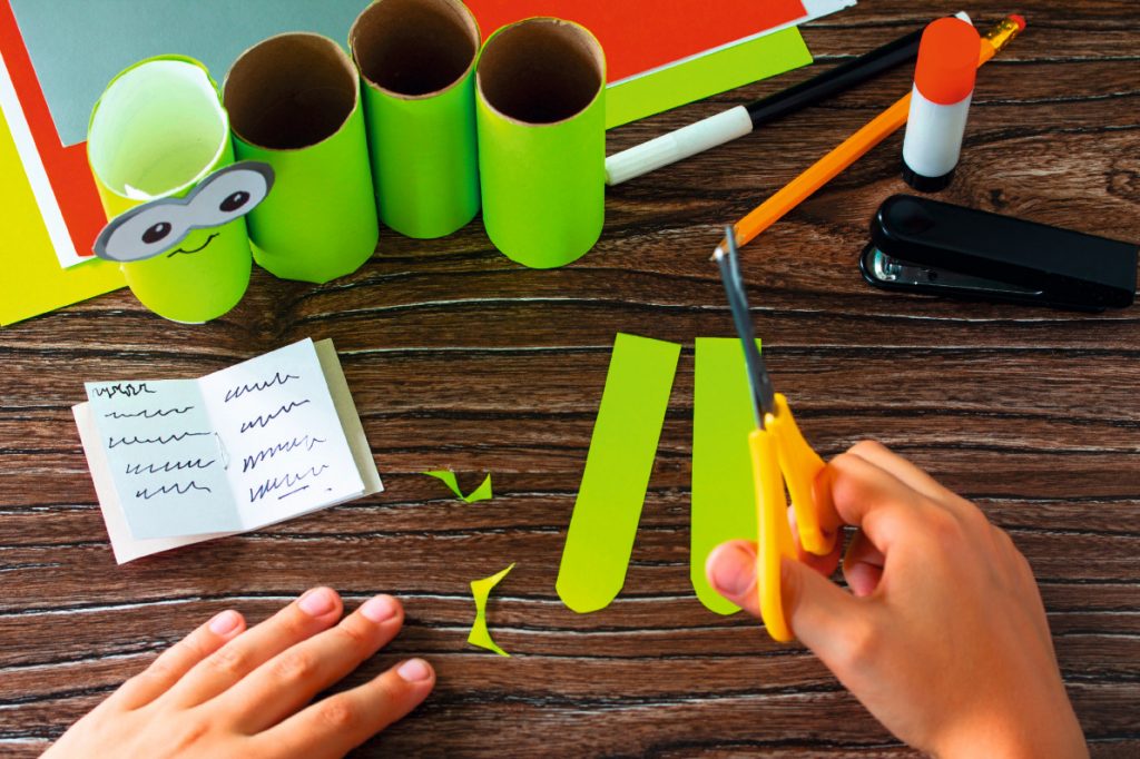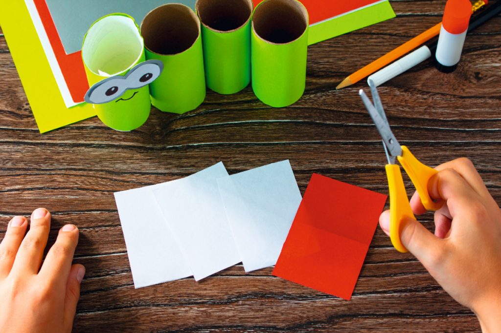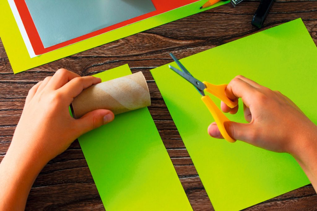 1. Schneide aus dem grünen Tonpapier breite Streifen und klebe sie um die Klopapierrollen.