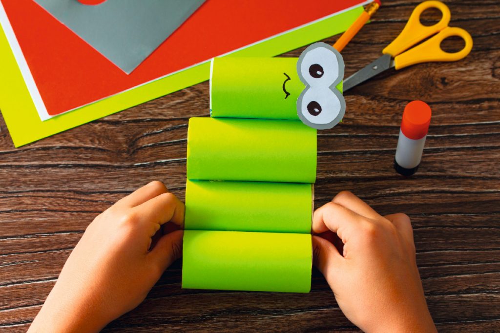 7. Aus grünem Papier entstehen zwei Arme für die Stifte-Raupe. Klebe sie am Raupen-Körper fest.