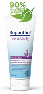 Bepanthol® SensiDaily Intensivpflege ist frei von Duft- und Farbstoffen und enthält einen hautfreundlichen pH Wert (5.5), ist vegan, frei von Mikroplastikpartikel gemäß UNEP Definition und auf für Säuglinge sowie als Basispflege bei Neurodermitis und zu Juckreiz neigender Haut geeignet.