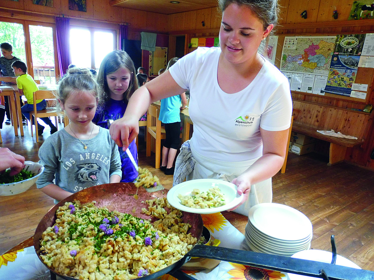 In der Alpenschule treffen wir uns dann und schon geht das Programm los: Bei lustigen Kennenlernspielen, beim Erkunden des Hauses und der Umgebung vergeht der erste Tag wie im Flug. Die frische Luft macht richtig hungrig und so schmeckt das gute, regionale Essen einfach köstlich!