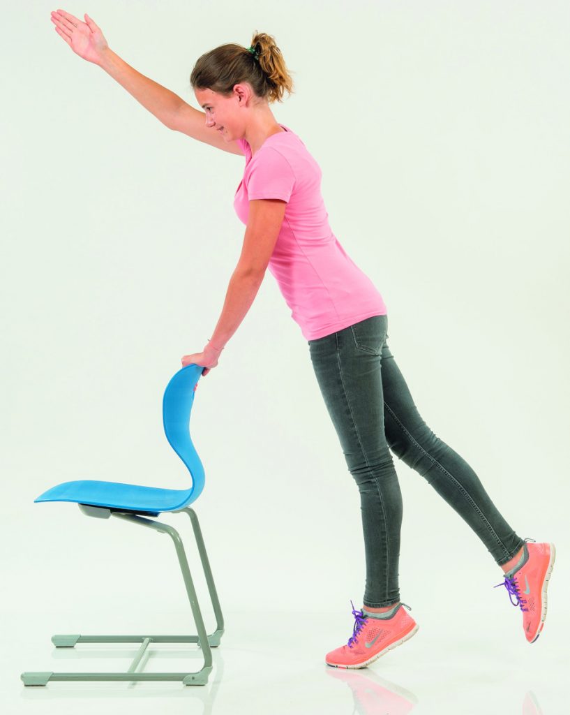 Stehe im Ballenstand, dein Körper ist in Schräglage. Achte auf deine Körperspannung. Wechsle nun zwischen Ballen- und Fußsohlenstand.