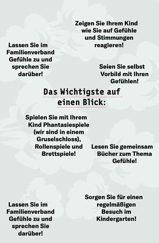 Von Geburt an erleben Kinder Gefühle: sie spüren, ob sie etwas mögen und nicht mögen, ob etwas guttut oder nicht. Sie können die Empfin- dungen noch nicht beschreiben oder zuordnen, aber sie können bereits darauf reagieren. Sind es zu Beginn Grundbedürfnisse wie Nahrung, Wärme, Sicherheit und Geborgenheit, so werden die Gefühle und Empfindungen und auch die Reaktionen darauf immer mehr und weiten sich auf andere Personen aus. Idealerweise beginnt die Förderung der emotionalen Kompetenz im Vorschulalter. Im Alter von 3-6 Jahren können Kinder Gefühle und Emotionen benennen, sie in Verbindung mit Handlungen bringen, erkennen wo und wie sich diese anfühlen, welche Bedürfnisse daraus entstehen und wie sie damit umgehen können. Kinder, die sich selber gut spüren und die Kompetenz haben, eigene Gefühle wahrzunehmen, können dies bei anderen Kindern und Bezugspersonen ebenso. Dies führt wiederum zu einer Förderung der sozialen Kompetenz.