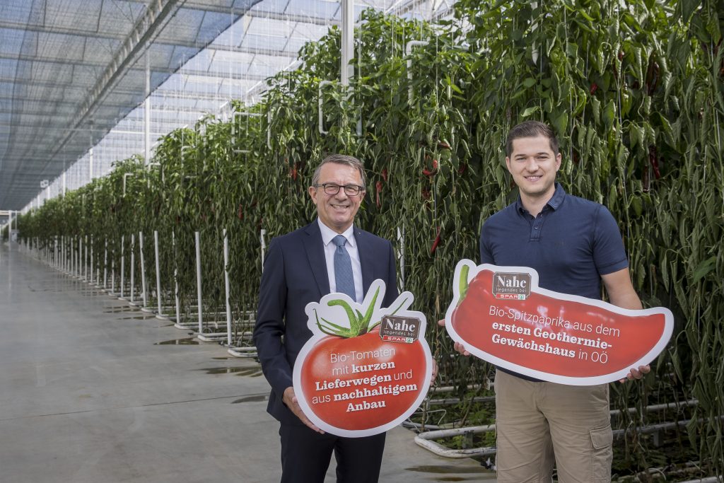 Von Oktober 2020 bis März 2022 wurde in Geinberg das erste Geothermie-Gewächshaus Oberösterreichs mit einer Investitionssumme von ca. 30 Millionen Euro errichtet. Der Anbau im klimaschonenden Gewächshaus am BIOhof Geinberg ermöglicht es, Bio-Tomaten und Bio-Spitzpaprika im Sommer sowie bereits ab Anfang März und bis Ende November – klimafreundlich und aus der Region – in die Regale von SPAR, EUROSPAR und INTERSPAR zu bringen. „Das nachhaltige Energiekonzept, die längere Verfügbarkeit von Bio-Tomaten und Bio-Spitzpaprika aus Österreich, damit einhergehende kurze Lieferwege und die Wertschöpfung in der Region sind Themen, die wir bei SPAR als in Österreich verwurzeltes Unternehmen schätzen. Umso mehr freut mich diese zukunftsweisende Partnerschaft am Standort in Geinberg“, betont SPAR-Vorstand Mag. Markus Kaser die gute und zukunftsweisende Zusammenarbeit der beiden Familienunternehmen Perlinger und SPAR.