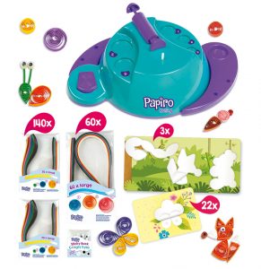 Das Papiro Quilling Set enthält alles was die lieben Kleinen fürs Quillen benötigen: eine Quilling Station, selbstklebende Papierstreifen in zwei verschiedenen Längen in je zehn unterschiedlichen Farben, 25 Vorlagekarten mit Kleber bereits an den richtigen Stellen.
