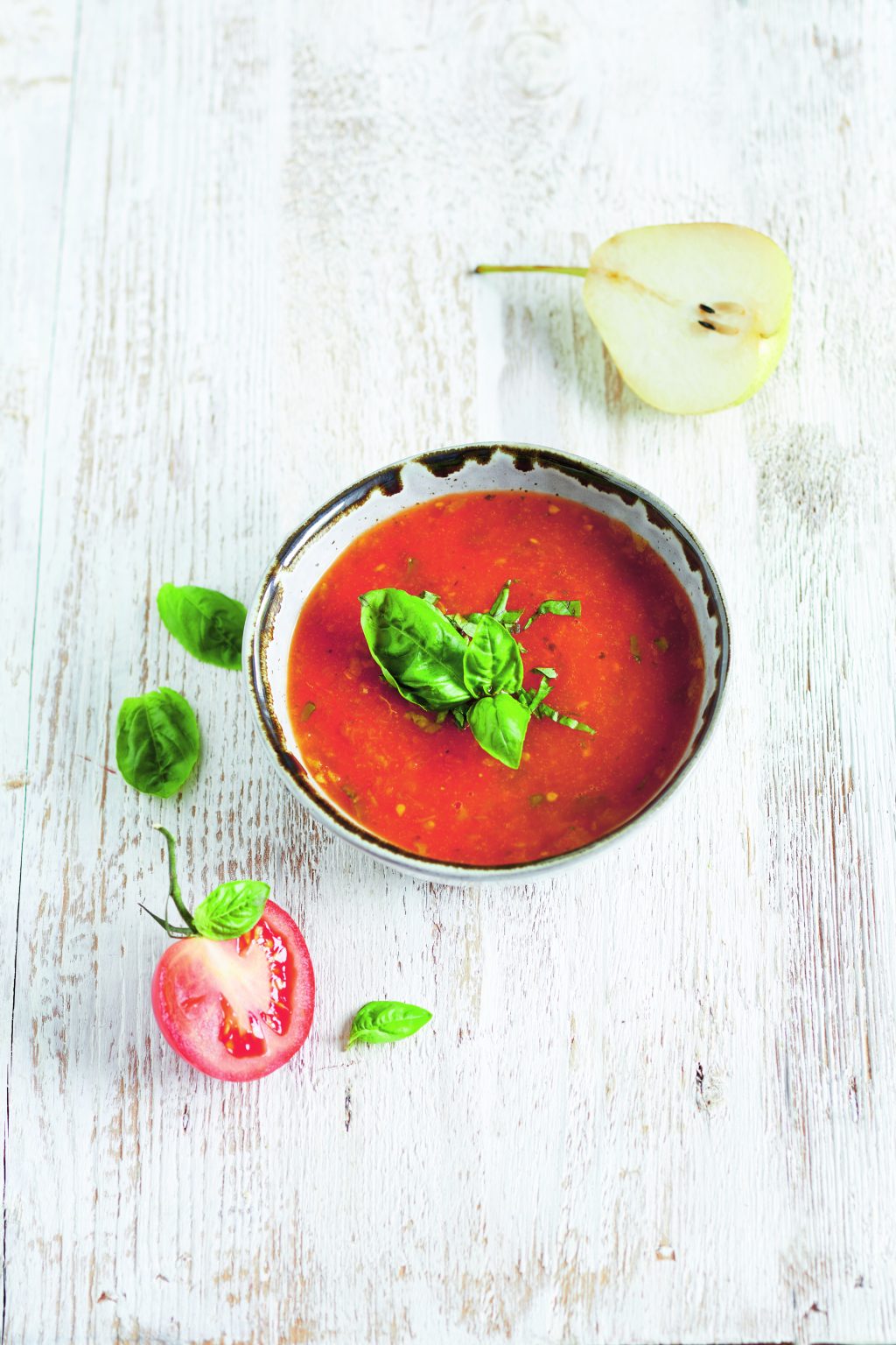 1. Die Tomaten 30–60 Sekunden in einen Topf mit kochendem Wasser geben, bis sich die Schale leicht löst. Die Tomaten herausnehmen, häuten und in grobe Stücke schneiden, sodass sie sich leicht pürieren lassen. Die Birnen waschen, vier teln und entkernen. Die Schalotten schälen. Beides in grobe Würfel schneiden.