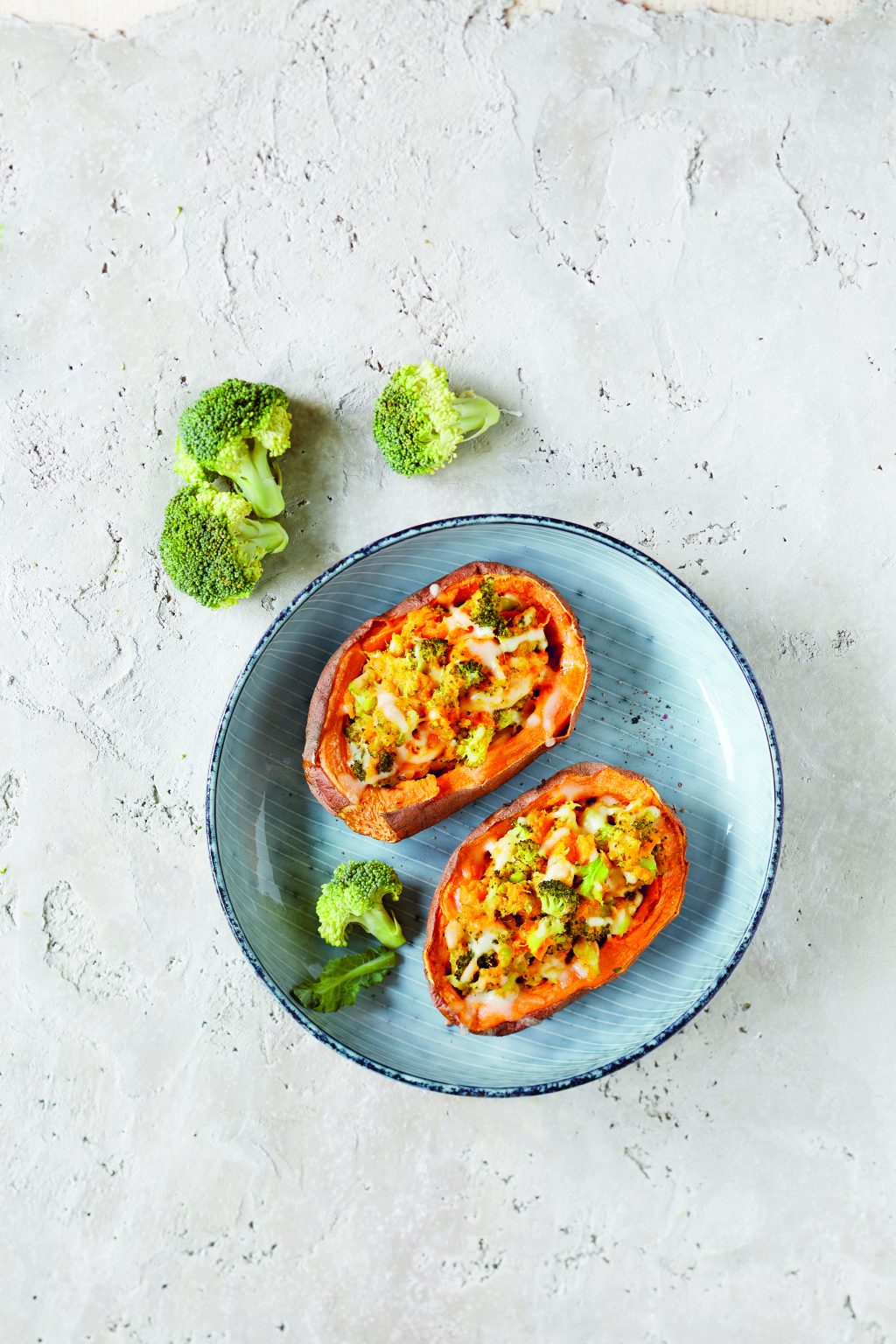 1. Die Süßkartoffeln waschen, auf einen Teller legen und in der Mikrowelle bei 800 Watt 15 Minuten garen. Den Brokkoli putzen, waschen und in Röschen teilen. Die Röschen in einen Dämpfeinsatz geben und in einem Topf mit wenig kochendem Wasser 3–5 Minuten dämpfen, bis er weich ist.