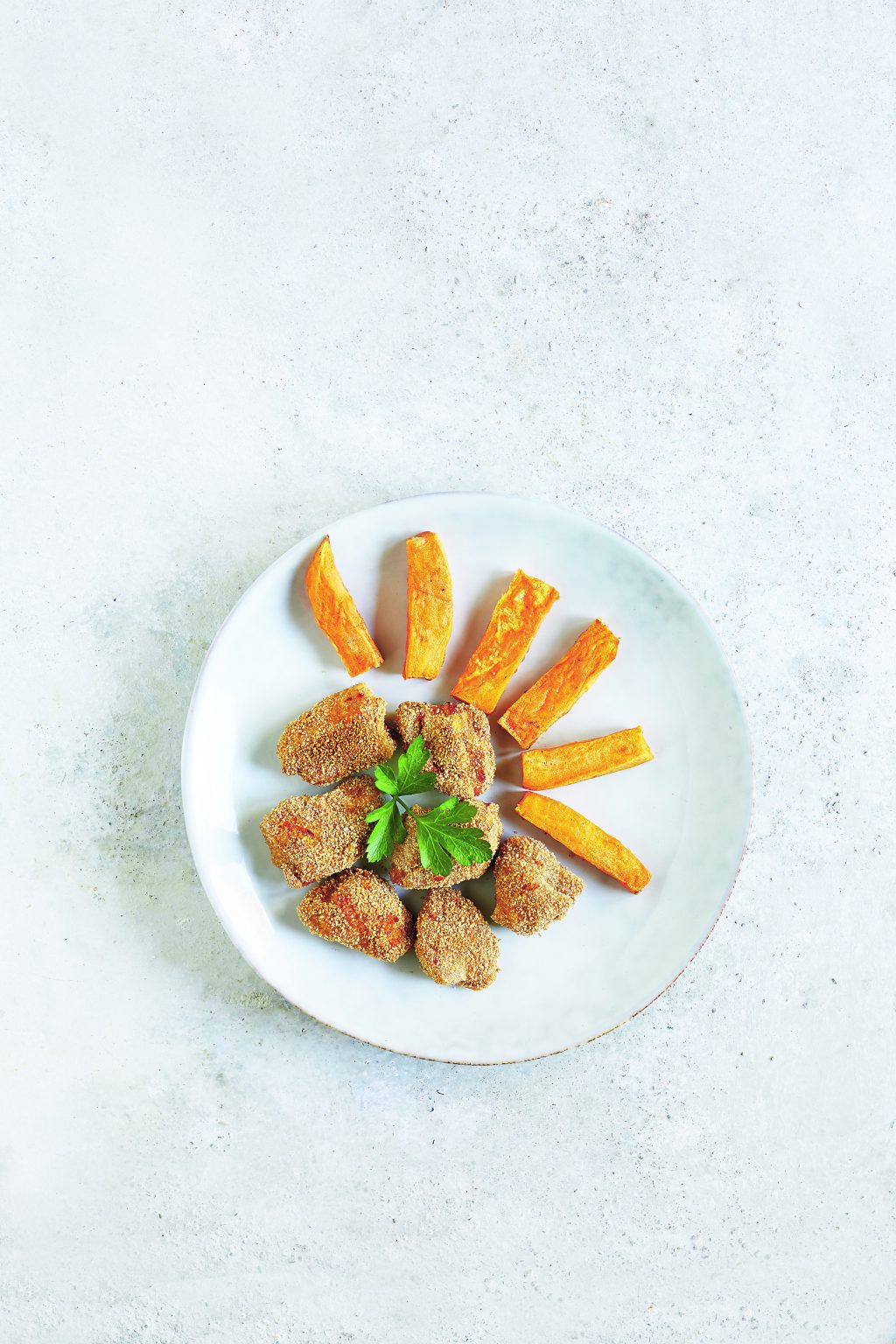 4. Nuggets und Süßkar toffeln auf ein Blech legen. Die Süßkartoffelwürfel mit Öl beträufeln, mit Salz und Pfeffer würzen. Nuggets und Süßkartoffeln im Backofen (mittlere Schiene) bei 140 °C.