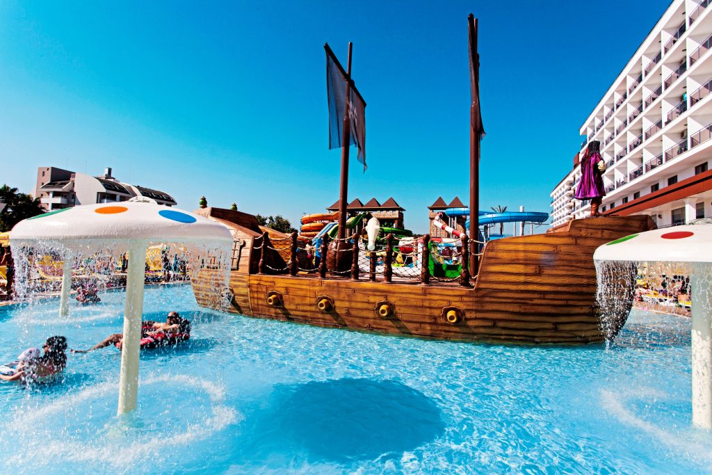 Der Aquapark ist das Herzstück dieses 4-Sterne-Familienresorts in der türkischen Region Alanya. 6 Wasserrutschen, drei Pools und ein eigener Kinderpool sorgen für unbegrenzten Badespaß. Dazu kommt ein feiner Sandstrand mit Liegen samt Sonnenschirmen und ein perfektes All Inclusive-Service.