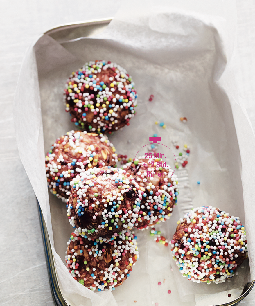 3 Aus der Müsli-Masse 10 Bällchen formen und diese in den Zuckerperlen wälzen, sodass sie damit rundherum überzogen sind. Die Energiebällchen zugedeckt über Nacht im Kühlschrank fest werden lassen.