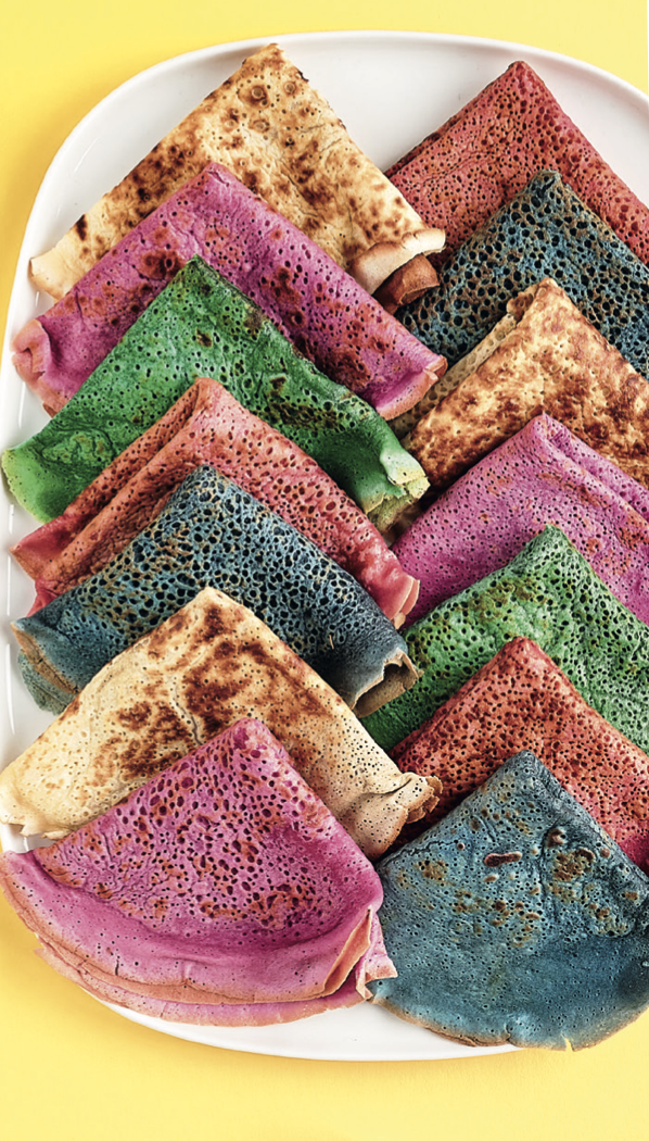 6. Zum Anrichten die Pfannkuchen entweder zweimal einklappen oder einrollen und in 3 cm große Stücke schneiden sowie mit der Schnittfläche nach oben anrichten.