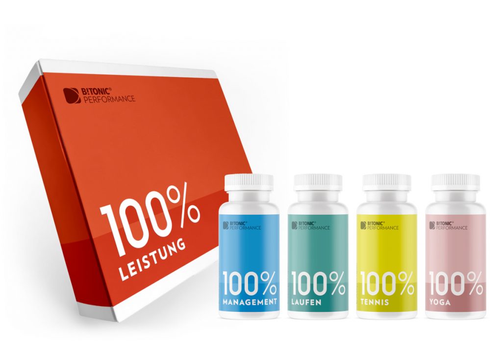 Das Range umfasst neben dem Präparat „100% Leistung“ noch vier weitere Produkte, die im Job, in der Freizeit mit der Familie oder beim Sport perfekt ergänzen und unterstützen: 100% Management, 100% Yoga, 100% Laufen, 100% Tennis.