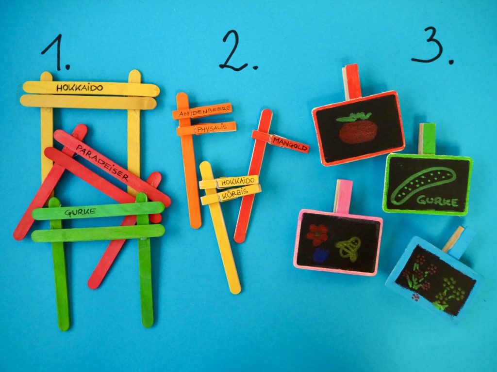 Auch bunte Schilder für die Setzlinge sind ganz leicht selbst zu machen. Dafür eignen sich etwa Holzstäbchen (zum Beispiel Eisstiele) oder Holzkluppen. Einfach zusammenkleben, mit wasserfester Farbe anmalen und beschriften – das Foto rechts zeigt ein paar Beispiele. Kinder, die noch nicht lesen können, malen das Angebaute auch gern auf ein kleines Täfelchen. So wissen sie genau, was wo wächst – auch, wenn die Pflanze noch keine Früchte trägt