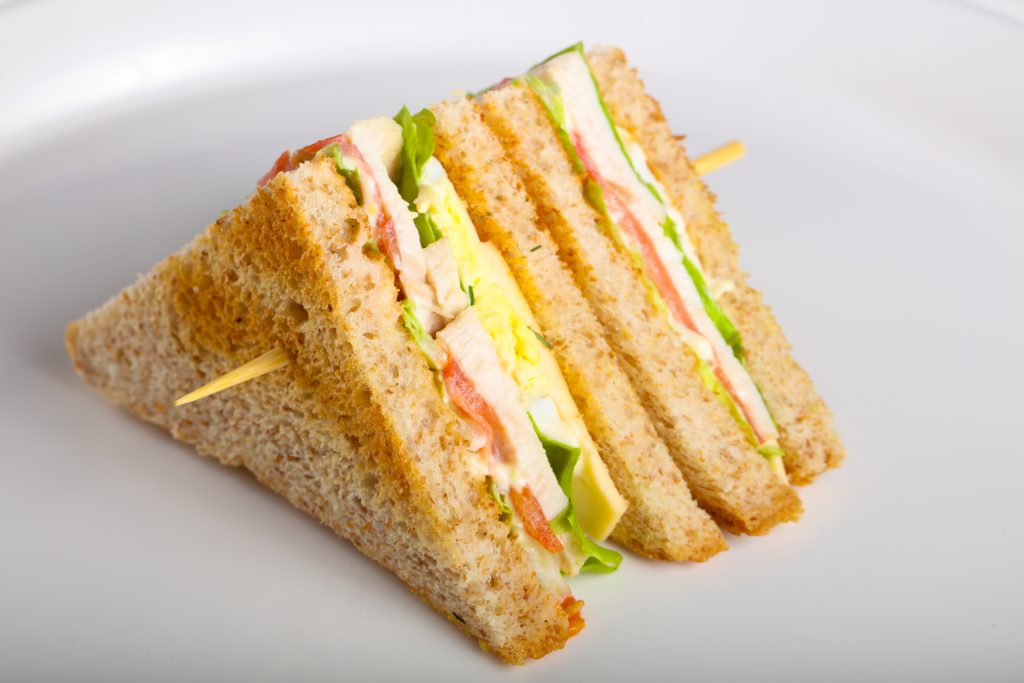 4. Das Sandwich mit der Putenbrust, den gewaschenen Salatblättern und den Tomaten- und Gurkenscheiben belegen. In 4 Dreiecke schneiden.