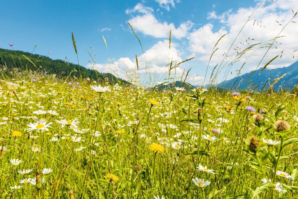 Der Blick auf eine blühende Almwiese zeigt eindeutig: so sieht biologische Vielfalt aus! Intakte Ökosysteme sind enorm wichtig für den Klimaschutz, für sauberes Wasser und wertvollen Humus. In ihnen lebt eine Vielzahl von Tieren und Pflanzen. Ihr Verlust würde den Menschen und seine Lebensgrundlage beeinträchtigen.