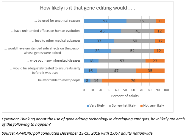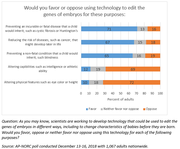 Die Nachrichtenagentur AP-NORC hat Ende 2018 über 1.000 US-Bürger über ihre Einstellung zum Thema Gen-Tests bei Embryos befragt. Die Ergebnisse waren dabei eindeutig. Die meisten der Befragten favorisieren Gen-Tests zur Vermeidung von Krankheiten oder erblich bedingten Behinderungen. Gleichzeitig gibt es eine klare Mehrheit, die gegen die Verwendung von Gentechnik zur Veränderung der physischen Merkmale des Ungeborenen ist, etwa die Manipulation der Augenfarbe oder die Steigerung der Intelligenz. Ausschlaggebend für die jeweilige Entscheidung waren dabei der Bildungsgrad der Betroffenen, deren religiöse Ausrichtung und deren Parteizugehörigkeit.