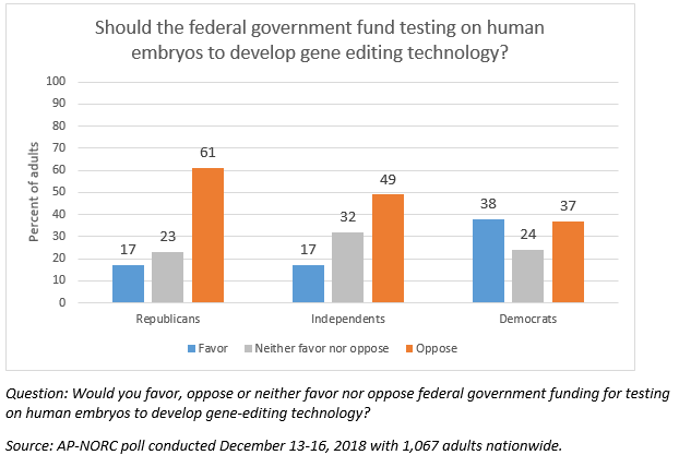Kaum Unterstützung erhält die Idee, die Gentechnologie mittels Steuergeldern in Form von Tests an menschlichen Embryos weiterzuentwickeln. 48 Prozent der US-Bürger lehnen das ab, nur 26 Prozent befürworten es. Anhänger der Republikaner sind dabei die stärkste Gruppe unter den ablehnenden Personen.