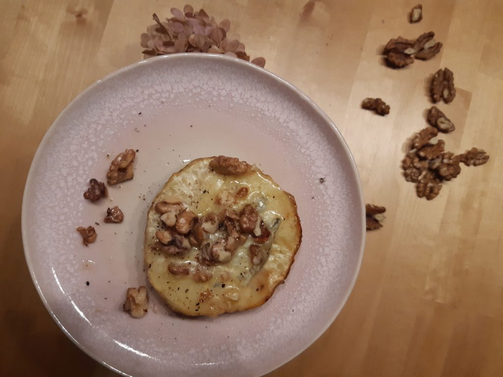 Die Sellerieknolle mit dem Messer schälen, in 1 cm dicke Scheiben schneiden und auf einem Backblech verteilen. Mit Olivenöl bepinseln und für circa 30 Minuten bei 175° auf mittlerer Schiene im Ofen backen. Den Käse und die Walnusskerne auf den Selleriescheiben verteilen und so nochmal für 5-10 Minuten im Ofen überbacken. Dazu passen Beilagen wie Dinkelreis, Hirse oder Bulgur und ein gemischter Salat. (Quelle: www.umweltberatung.at)