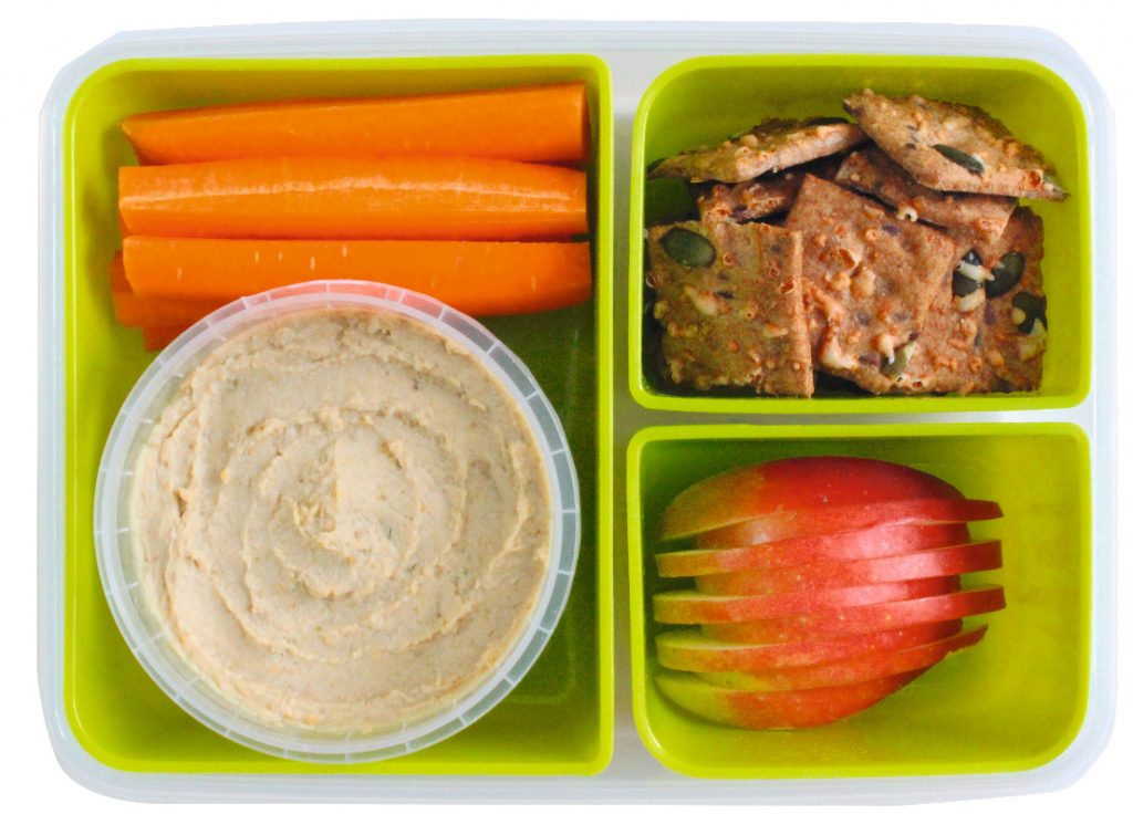 1. Hummus in Behälter oder Lunchboxfach füllen.