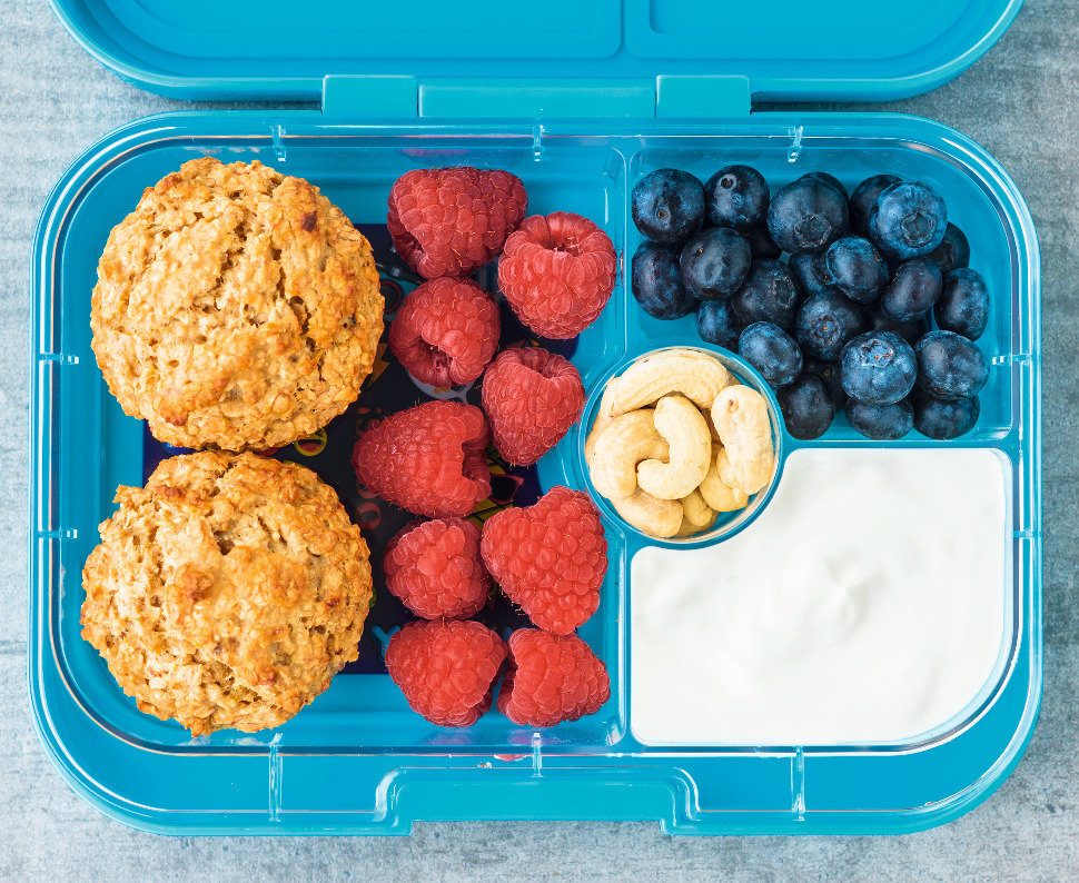 5. Muffins ca. 15 Minuten backen. Muffins, Beeren, Joghurt und Cashewkerne schön bunt in der Pausenbox anordnen.
