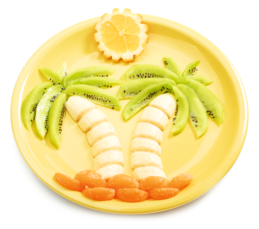 6. Palmenblätter: Kiwihälften längs in Scheiben schneiden, die Palmenblätter um die Bananenstämme arrangieren.