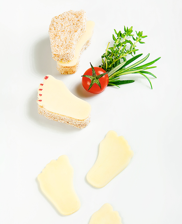 1. Mit einem Ausstecher in Form eines Fußes aus Vollkorn-Toastbrot oder Vollkornbrot und dem Käse die Käsefüße ausstechen.