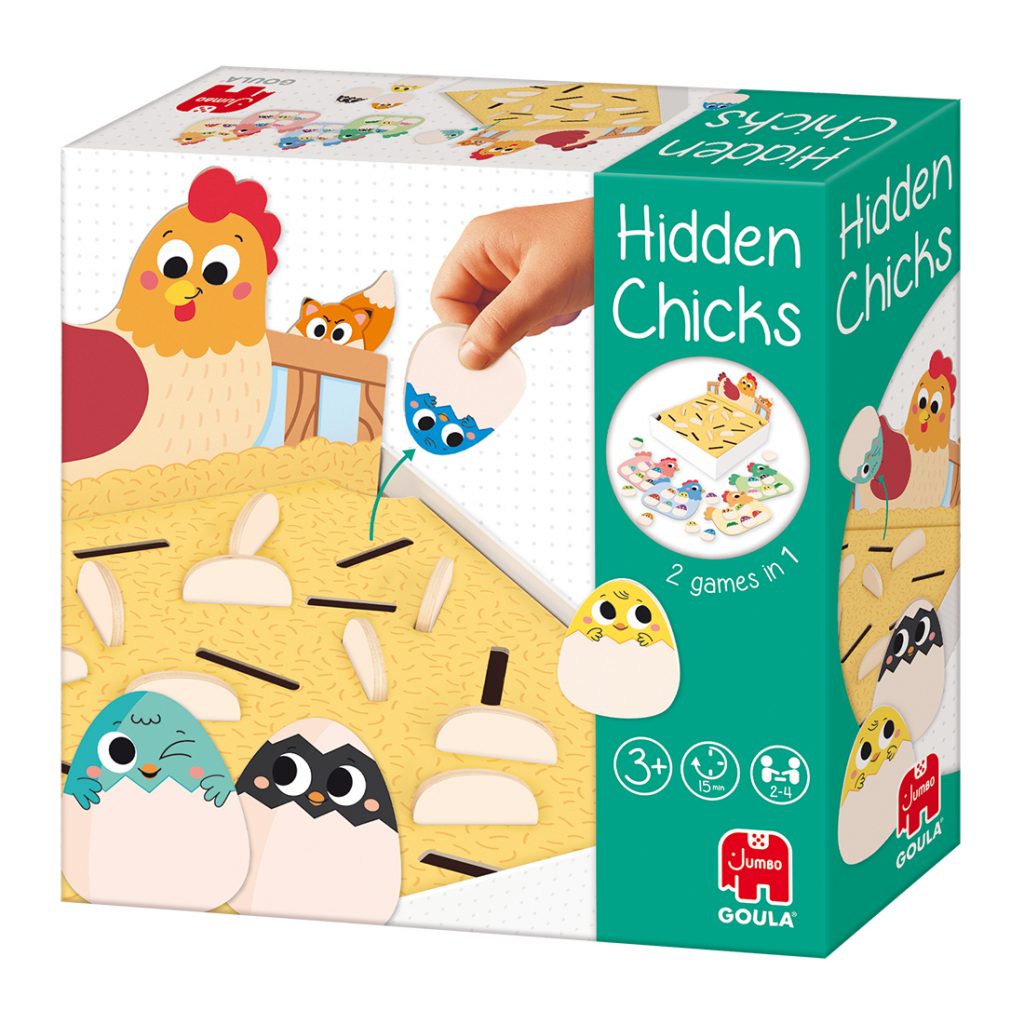 wo welches farbige Küken sich versteckt, kann sein hennenförmiges Spielbrett und damit die Hühnerfamilie als erstes