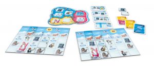 Bei „Pinkuins“ dreht sich alles um die gleichnamige, aufstrebende Band, die ihr Debüt in der Antarktis feiert. Für eine gelungene Show muss der Aufbau stimmen und zwei bis vier Kinder sind aufgerufen, das passende Setup jeweils auf ihrer Ablagetafel zu gestalten. Dafür liegen offen auf einer Eisscholle witzig illustrierte Motiv-Plättchen mit unterschiedlichen Punktwerten. Durch das Ausspielen einer Handkarte dürfen sich die Rock-Kids ein oder zwei Plättchen nehmen und auf ein freies Feld ihrer Tafel mit passendem Motiv platzieren. Am Ende soll eine möglichst große Fläche waagrecht und senkrecht miteinander verbundener Plättchen entstehen. Meist gibt es mehrere Möglichkeiten zum Ablegen, weshalb es heißt, einen kühlen Kopf zu bewahren und einen guten Platz zu finden. Denn einmal gelegte Plättchen dürfen nicht mehr bewegt werden.