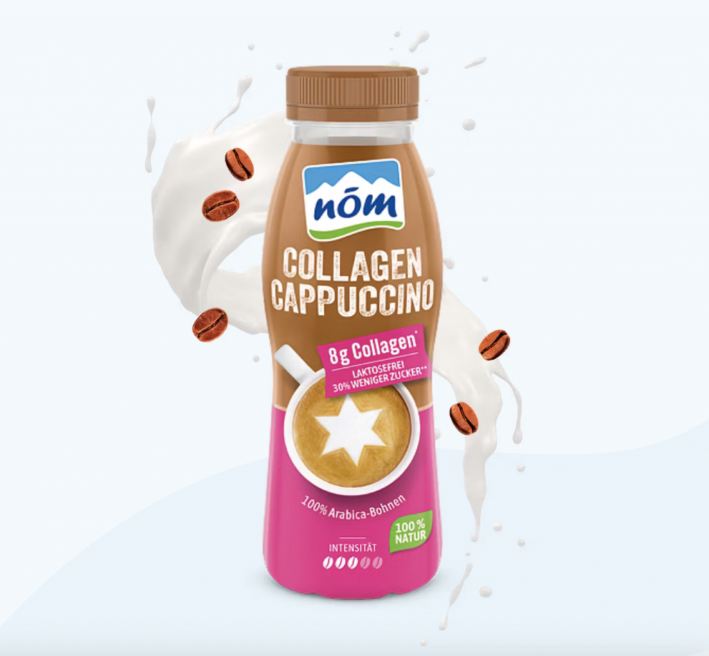 Der neue NÖM „to go Collagen Cappuccino“ ist mit 8 g Collagen pro Flasche und 30 % weniger Zucker außerdem laktosefrei und ungekühlt haltbar, und damit ideal für den aktiven Lifestyle und die tägliche Beauty-Routine.
