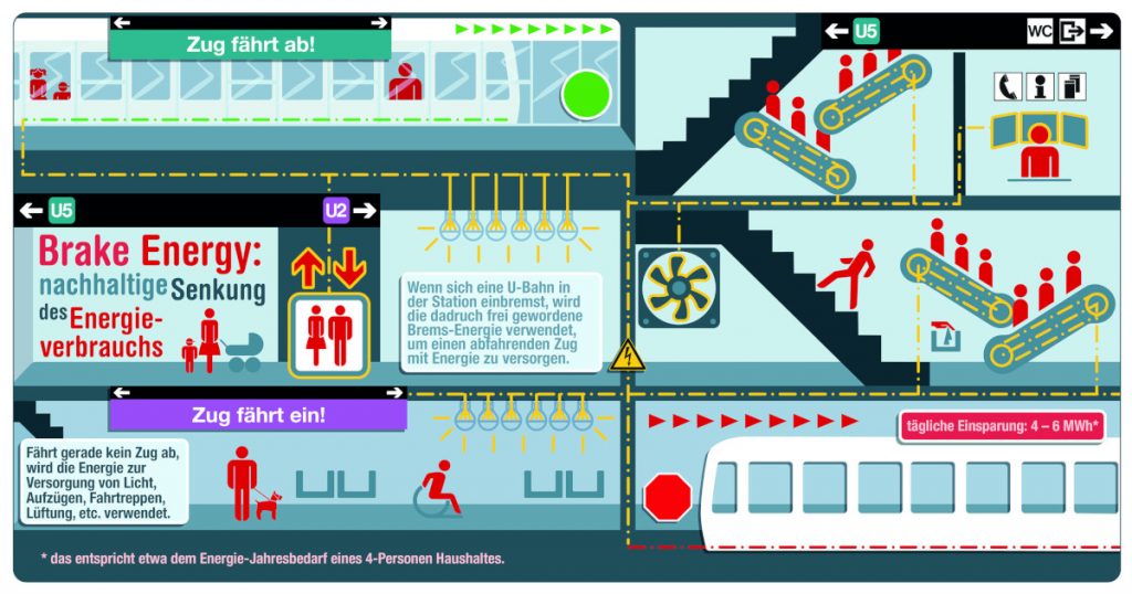Ist gerade kein Zug in der Umgebung, kommt das Forschungsprojekt Brake Energy zum Einsatz. Die Bremsenergie wird dann ins hauseigene Wechselstromnetz eingespeist und kann so Rolltreppen, Beleuchtung und Aufzüge mit Strom versorgen. Aktuell gibt es zwei dieser Anlagen: bei der U2-Station Hardeggasse und der U1-Station Altes Landgut. Weitere Anlagen sind geplant.