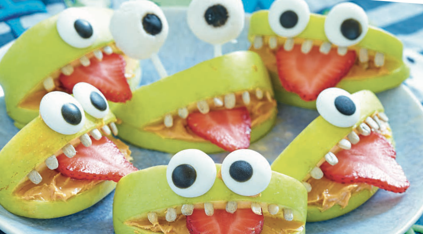 Diese witzigen Apfelmonstermünder sind ein lustiger und gesunder Snack für Halloween.