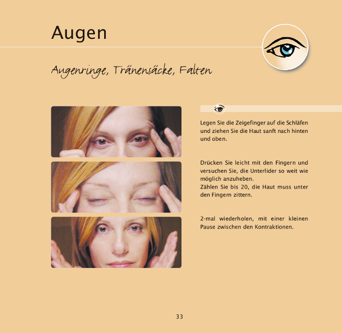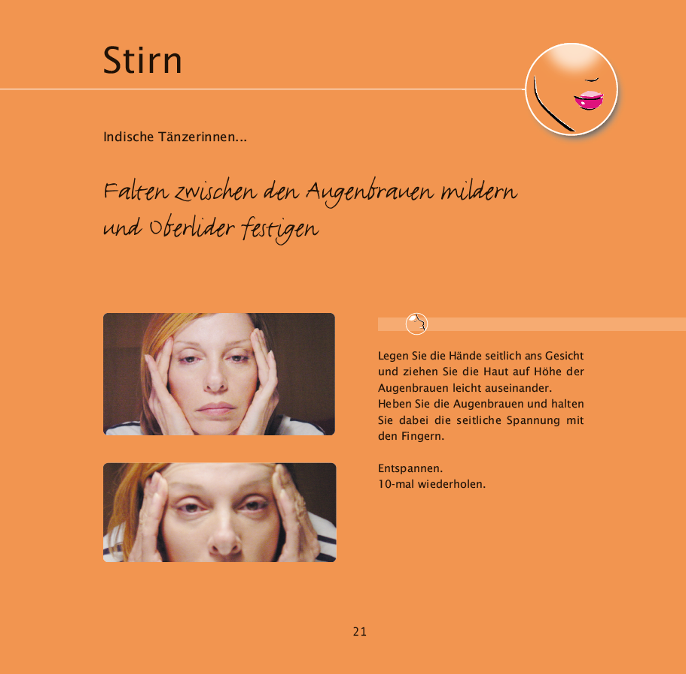 Wir haben Übungen für Stirn und Augen ausgesucht. Bevor ihr mit der Gesichtsgymnastik startet, noch ein wichtiger Tipp aus dem Buch: Die Übungen fest und sanft zugleich ausüben – nie an der Haut zerren!