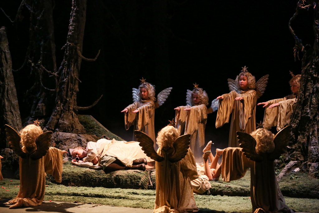 Das arme Geschwisterpaar Hänsel und Gretel wird von seiner Mutter zum Beerensuchen in den Wald geschickt. Bald schon finden die Kinder nicht mehr nach Hause und verbringen unter dem Schutz von 14 Engeln die Nacht im Wald.