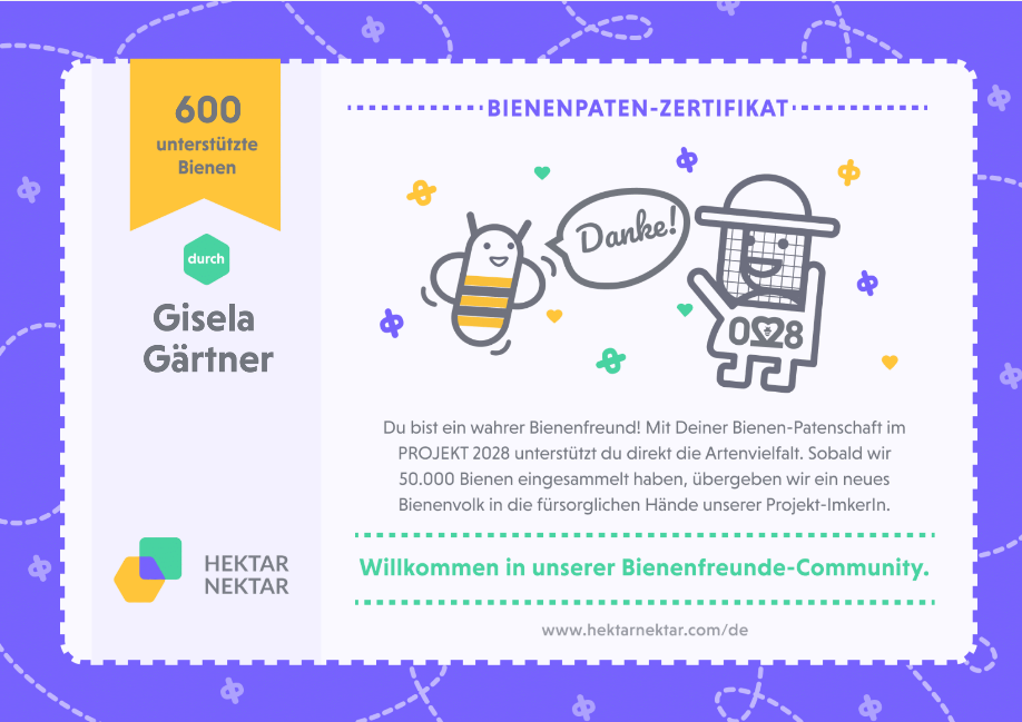 Eine Bienenpatenschaft von Hektar Nektar kann man auch schenken. Schon mit 5 Euro wird man selbst oder der Beschenkte – etwa Kinder oder Enkelkinder – zur Bienenfreund*in. Wer 30 Euro und mehr spendet, erhält neben einer schönen Urkunde auch Honig von Hektar Nektar-Bienenvölkern als kleines Dankeschön. Übrigens: 30 Euro bedeuten 600 Bienen, die zusätzlich durch die Landschaft summen und ihren wichtigsten Job erledigen – Pflanzen zu bestäuben und so dafür zu sorgen, dass wir alle etwas zu Essen haben. Transparenz wird bei Hektar Nektar großgeschrieben. Martin Poreda, einer der Gründer von Hektar Nektar: „Spender wissen bei uns immer welche Imkerin oder welchen Imker sie unterstützen und wo dessen Bienenstöcke stehen.“ Wer will, kann seine Bienen in Abstimmung mit der Imkerin oder dem Imker auch besuchen.