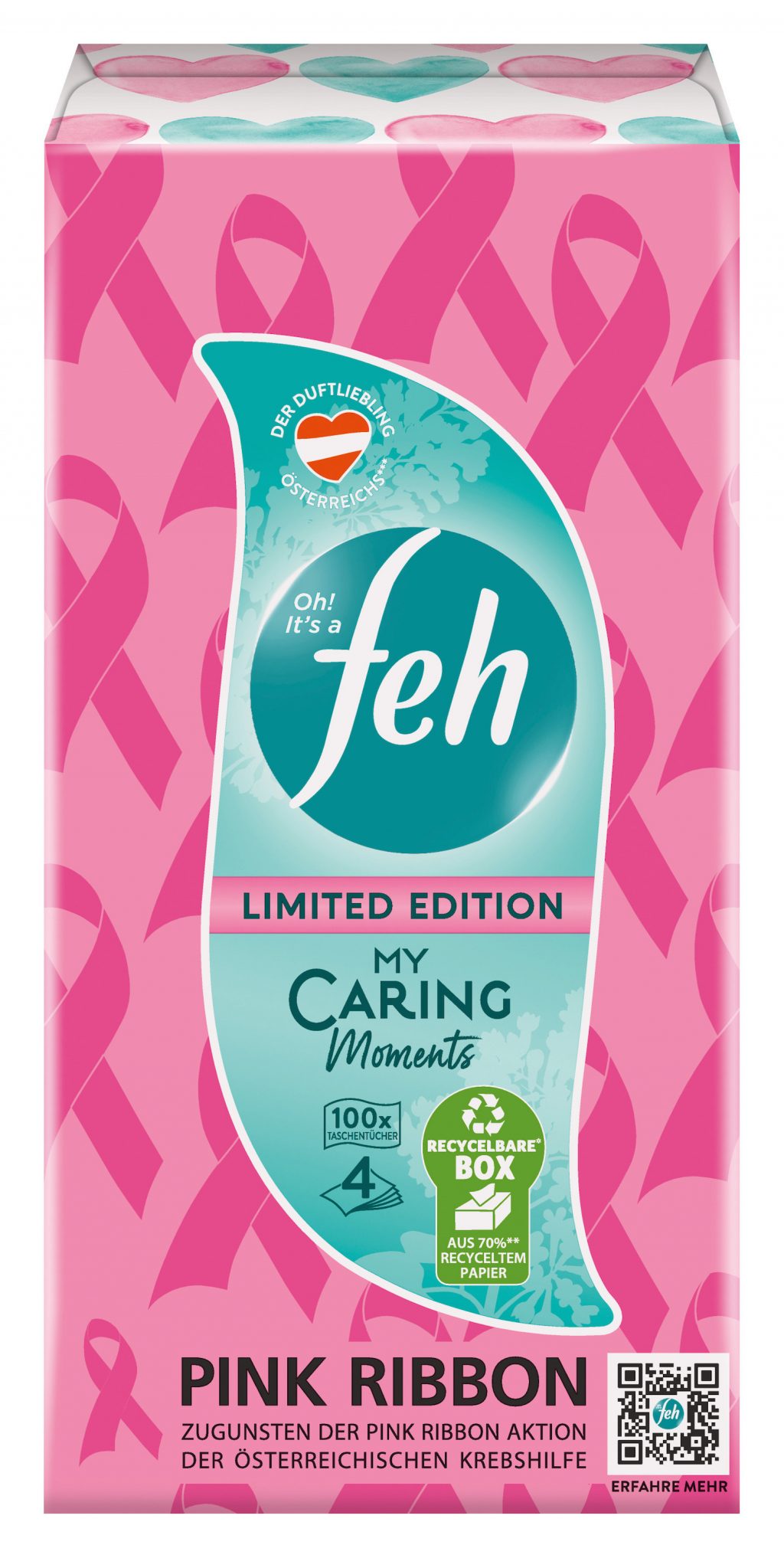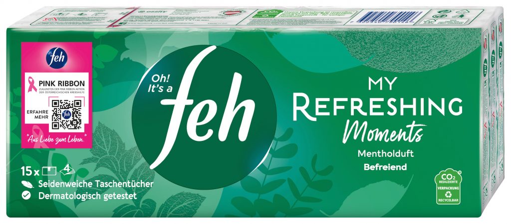 Eine wesentliche Mission von Pink Ribbon ist es, Menschen für das Thema Brustkrebsvorsorge und -früherkennung zu sensibilisieren. Da dies mit zahlreichen Partner:innen an der Seite noch erfolgversprechender ist, machen nun auch feh und Pink Ribbon Österreich gemeinsame Sache. Die feh Limited Edition Taschentuchbox My Caring Moments mit 100 Tüchern und blumig- elegantem Duft sowie feh Taschentücher My Classic Moments, My Refreshing Moments und My Wellness Moments (15er- und 30er-Packung) sind von Q4/2023 bis Q1/2024 bei BIPA, REWE und SPAR erhältlich.
