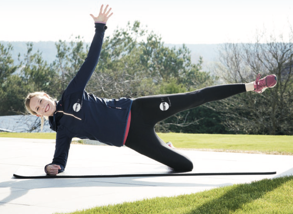 Seitliche Plank (Unterarm- stütz), Knie 90° angewinkelt, Oberschenkel und Oberkörper in einer geraden Linie, oberer Arm gestreckt. Zur Intensivierung wird nun das obere Bein gehoben und ausgestreckt.
