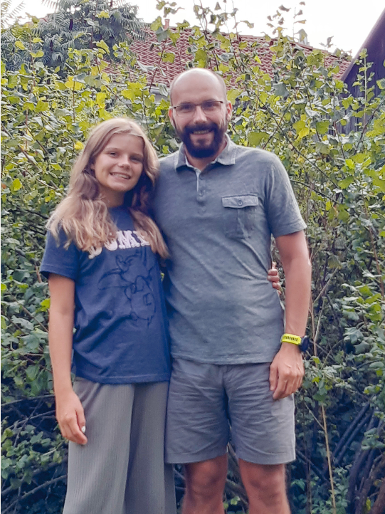Jürgen: Mit einem Jahr bemerkten wir, dass ihr rechtes Knie angeschwollen war, sie schlief unruhig und weinte oft. Es war ein langer Weg von Arzt zu Arzt, bis wir schließlich Gewissheit hatten: Lara litt an Rheuma. Als wir die Diagnose erfuhren, ging es uns sehr schlecht. Wie würde das Leben für Lara und uns nun weitergehen? In der Folge waren dann auch ihr anderes Knie, die Knöchel, der Kiefer und die Finger betroffen und sie musste ständig Medikamente nehmen. Mit drei Jahren wurde es ganz schlimm. Sie wollte gehen und sagte plötzlich „Papa, ich kann mich nicht mehr bewegen!“ Sie hatte unglaublich starke Schmerzen und es stellte sich heraus, dass Rheuma auch die Halswirbelsäule befallen hatte. Es kann nun immer wieder passieren, dass sie solche Schübe erleidet. Seit 2019 muss sie einmal die Woche eine Spritze bekommen.