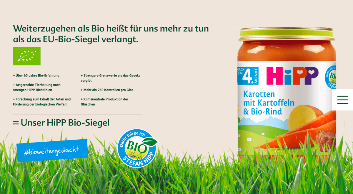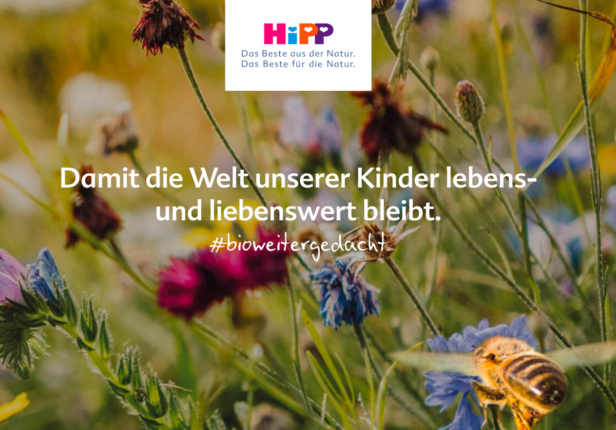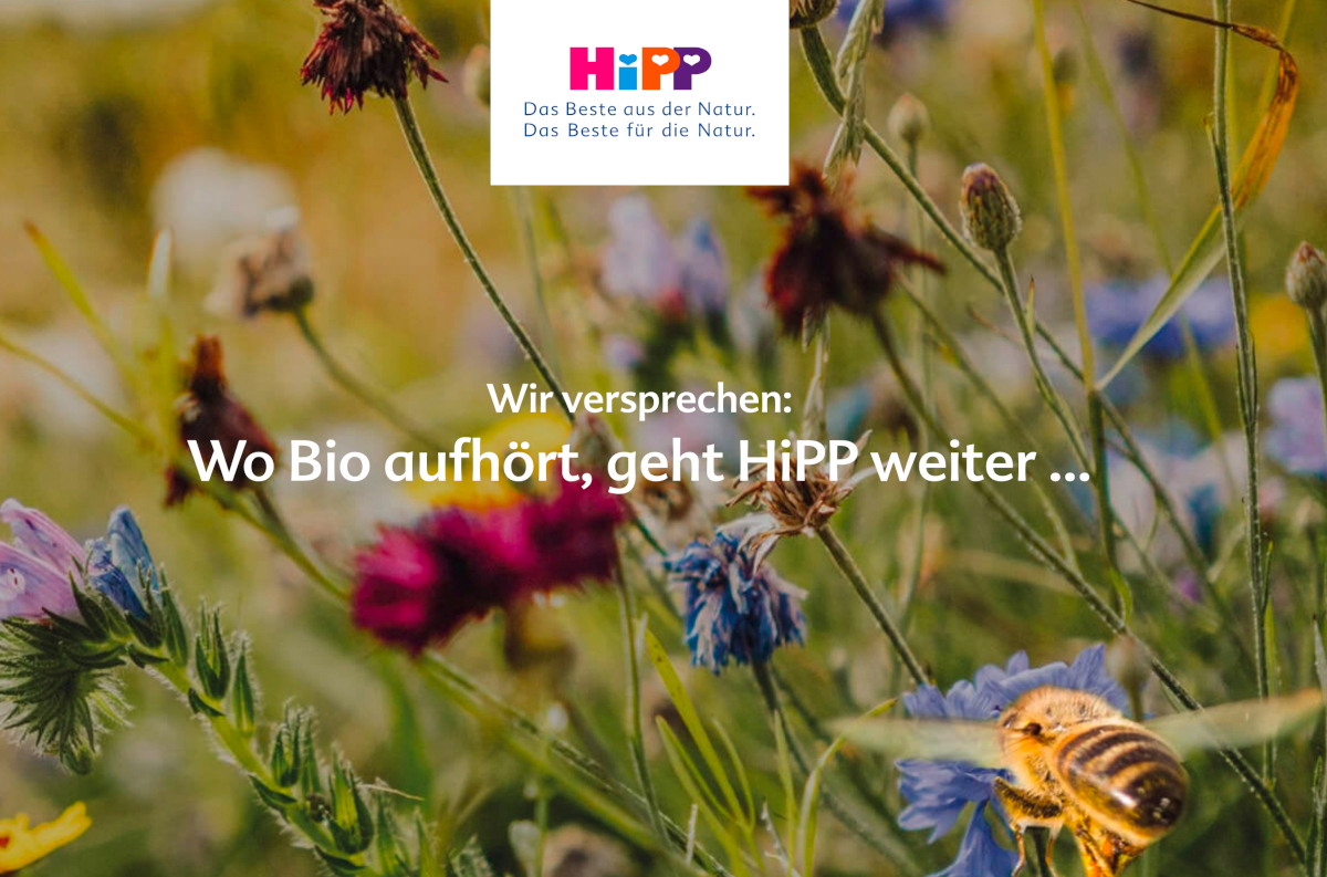 „Wo Bio aufhört, geht HiPP weiter“ – so das Motto des Lebensmittelproduzenten. Über die Kampagne „Bio weitergedacht“ erhält der Konsument Infos darüber, welche Richtlinien sich die Firma in der Babynahrungsherstellung auferlegt hat, zeigt welche Rohstoffe verarbeitet werden und gibt auch Auskunft über die HiPP Tierwohlinitiave.